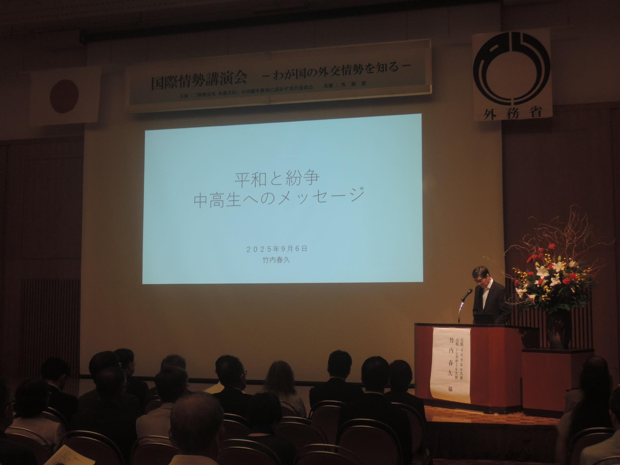 まず、駐イスラエル大使、駐シンガポール大使などを歴任された、元外務省職員の竹内春久様から、「平和と紛争、中高生へのメッセージ」というテーマで基調講演をいただきました。